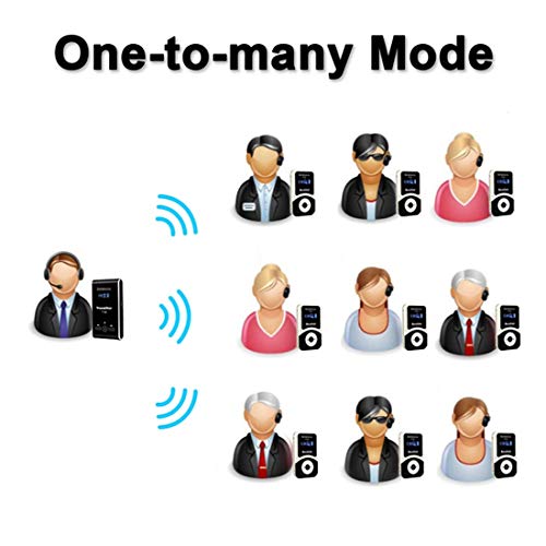 Je kunt ontelbare ontvangers toevoegen. Zolang de zender niet meer dan 60 meter afstand is, kan hij functioneren; ontvanger heeft een 600 mAh lithiumbatterij, dus hij kan 18 uur werken; elke reisladderontvanger beschikt over een hoofdtelefoon, een oplaadkabel en een draagriem
